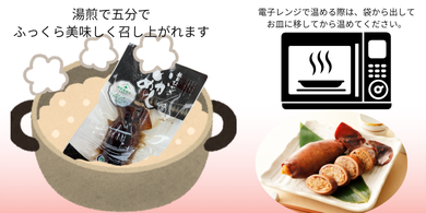 調理も簡単で、電子レンジ対応はもちろん、袋のまま湯せん5分であつあつのいかめしが完成。忙しい日や急な来客にも、すぐに本格的な一品をお出しできます。